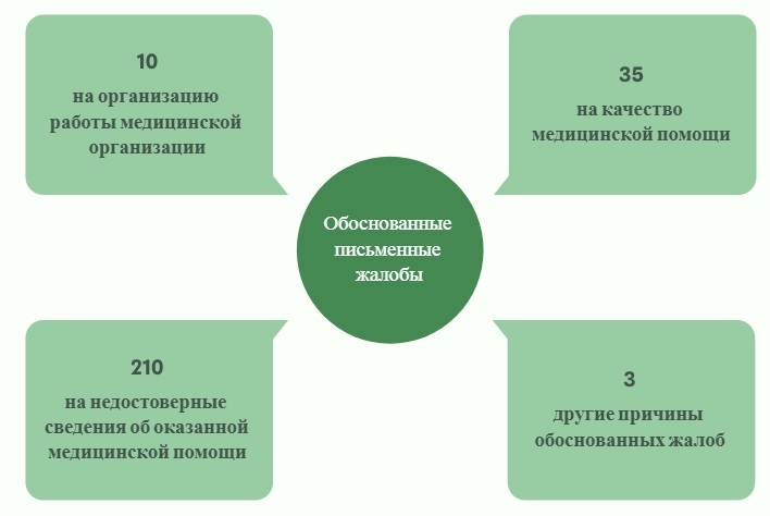 Было рассмотрено 376 письменных жалоб застрахованных граждан о нарушениях при предоставлении им медицинской помощи, из них 261 – обоснованные, из них:
